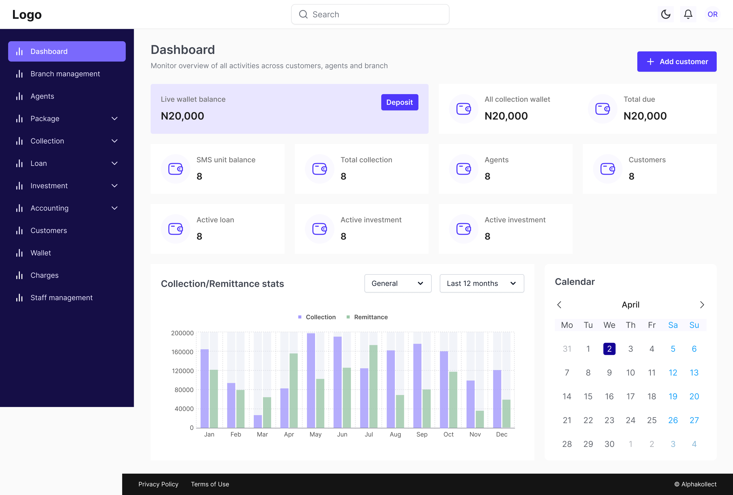 Monitor and manage all agents and customers collections and their activities